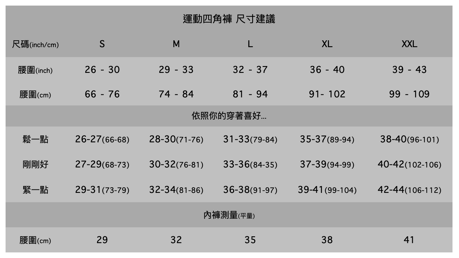 「經典三角褲系列 Size M.」 建議選擇「短版四角褲系列 Size L.」,以此類推!